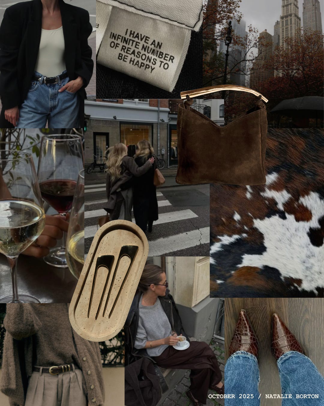 October always feels like a turning point — the air shifts, the layers come out, and routines feel a little more steady. This month’s moodboard is all about the pieces and textures I’m reaching for right now: chocolate suede, croc-embossed leather, sculptural brass, lived-in denim with a sharp blazer, and the kind of knits that make you want to cozy up with a good book.